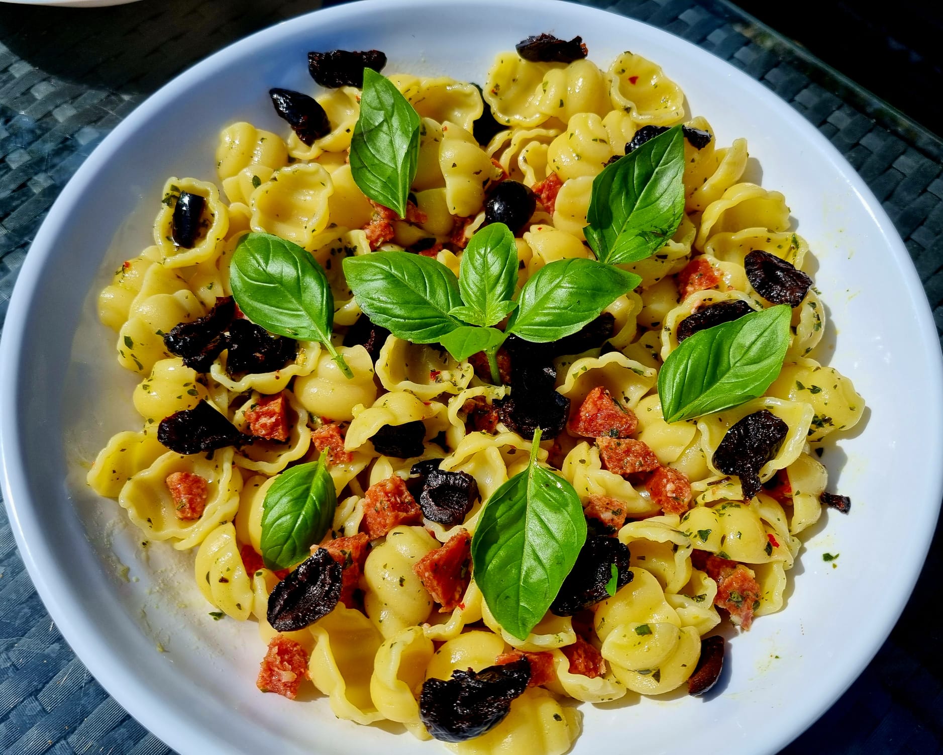 Salade van Gnocchi met salami en gedroogde zwarte olijven