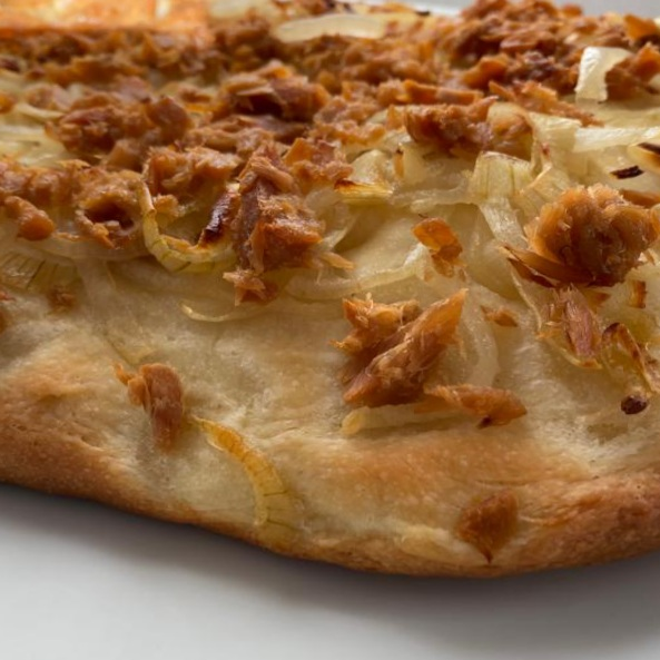 Focaccia met tonijn en gestoofde witte ui