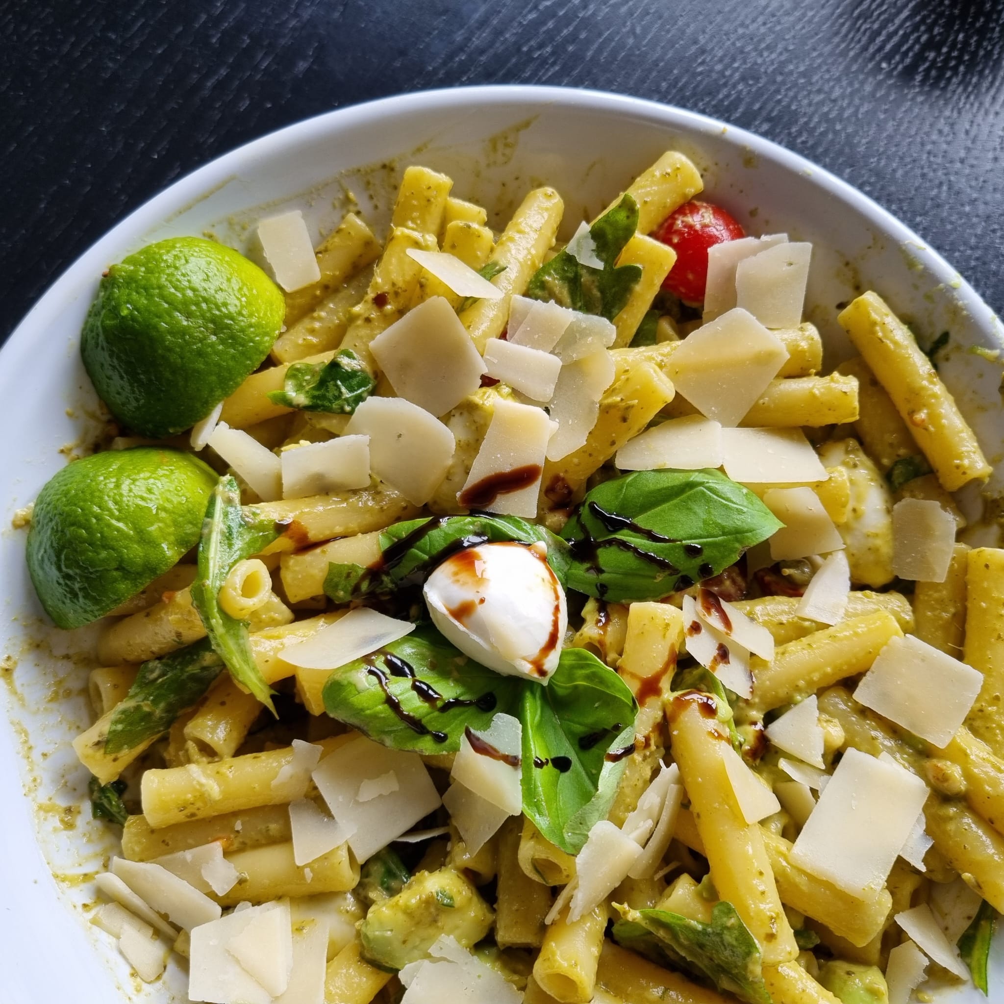 Sigarette ziti (gladde buisjes pasta) met basilicum en citroen pesto